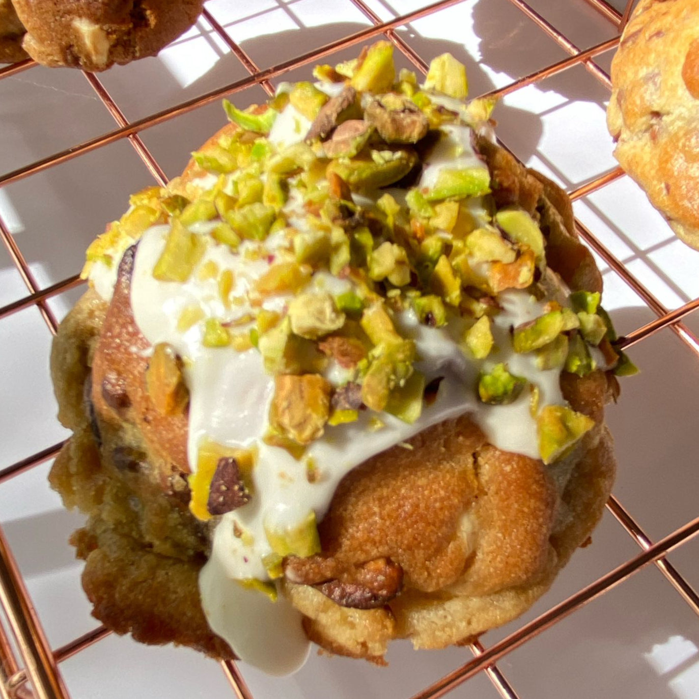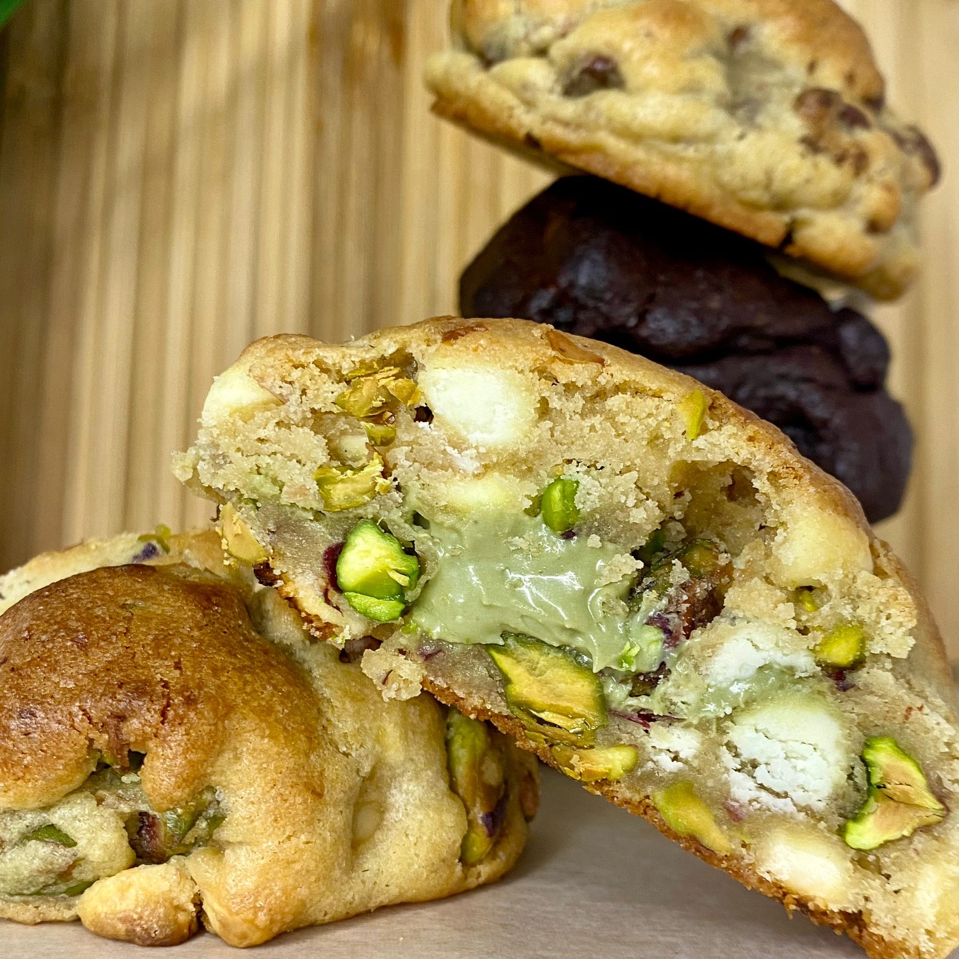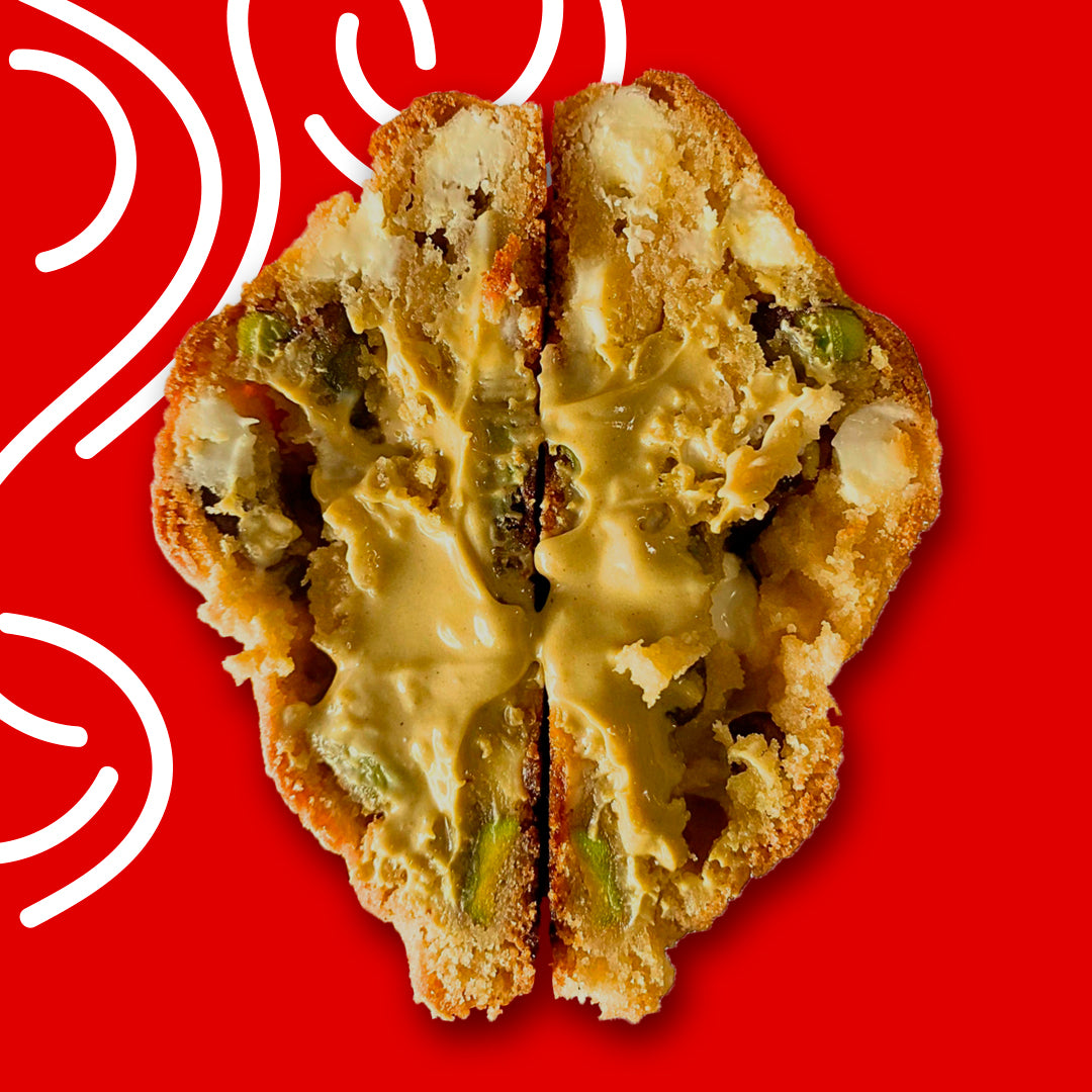 Delicious vanilla cookie enriched with white chocolate chunks and pistachios, topped with an irresistible pistachio cream. Each bite offers a perfect combination of crunchy and creamy textures that will leave you wanting more. A sophisticated treat you won't be able to resist.